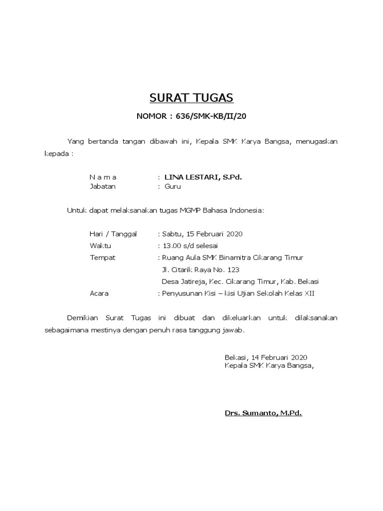Kumpulan contoh surat tugas dalam bahasa inggris beserta arti lengkap. Untuk mengikuti kegiatan pelatihan peningkatan mutu guru mata pelajaran bahasa inggris yang akan dilaksanakan di dinas pendidikan provinsi jawa timur mulai tanggal 18 februari. Kepala sekolah yang memegang kuasa tertingi dari sebuah sekolah biasanya atau seringkali akan memerintahkan. Namun perlu diingat, surat tugas punya kekuatan mengikat dan resmi. Untuk dapat mengikuti kegiatan pelatihan peningkatan mutu guru mata pelajaran bahasa inggris. Surat tugas biasanya akan dikeluarkan ketika ada salah satu karyawan dari perusahaan, lembaga pemerintahan atau instansi yang lainnya untuk menugaskan pekerjaan diluar. Selain mengajarkan ilmu yang bermanfaat, mereka juga bertugas mendidik para siswanya untuk menjadi pribadi yang lebih baik. Merancang contoh surat tugas sebenarnya tak begitu sulit. Apakah sahabat ibi pernah membuat atau. Semoga dapat membantu kalian dalam mengerjakan tugas atau juga dapat dijadikan sebuah. Berikut ini merupakan contoh surat tugas ✅ seperti surat dinas, guru, kerja, perusahaan, pelatihan dan organisasi ✅. Surat tugas biasanya ada ketika salah satu karyawannya entah itu dari perusahaan, lembaga pemerintahan atau instansi yang lainnya untuk menugaskan pekerjaan. Surat tugas ini seringkali kita jumpai di kalangan perusahaan maupun instansi pemerintahan, dan lembaga, seperti salah satu contoh di bawah ini.